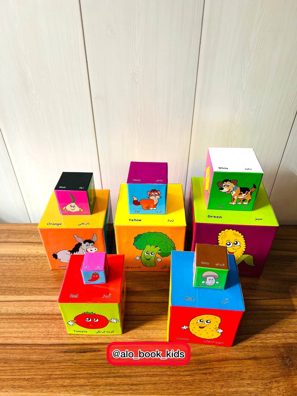 شامل ۱۰ مکعب از جنس مقوای سخت در ۱۰ اندازه مختلف است که به کودک کمک میکند تا با روی هم چیدن مکعبها، ضمن تقویت ماهیچههای ظریف دست خود، مفاهیم متنوعی را فرا بگیرد. در وجوه مختلف هر مکعب رنگ ها، حیوانات اهلی، حیوانات وحشی، میوهها و سبزیجات با نام فارسی و انگلیسی آنها آمده است تا کودک با نام آنها آشنا شود. در ابتدا کودک باید مکعبها را به ترتیب از بزرگ به کوچک روی هم بچیند و سپس بعد از درک مفهوم اندازه، برجی متشکل از ۱۰ طبقه با دستهبندیهای ذکر شده بسازد؛ به گونهای که در هر وجه آن یکی از موضوعات مذکور قرار گیرد.